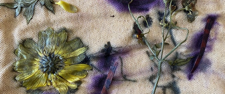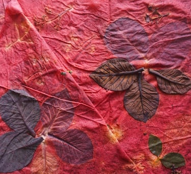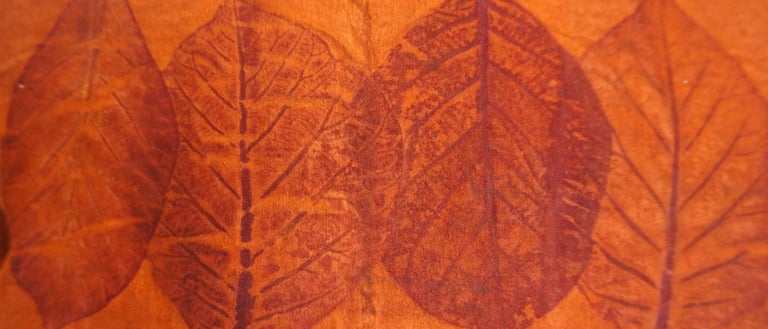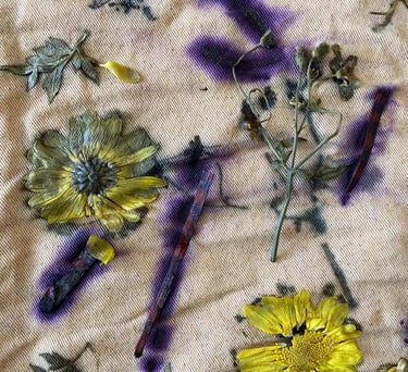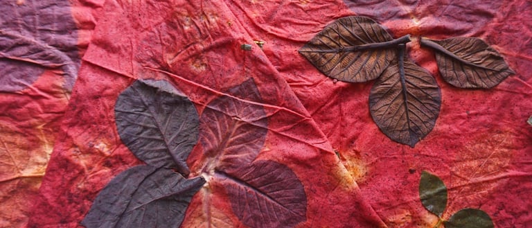 Botanical treasures are artfully placed on the fabric, then bundled and steamed for two hours. During this time, the plant's natural pigments are permanently transferred, leaving their imprint.