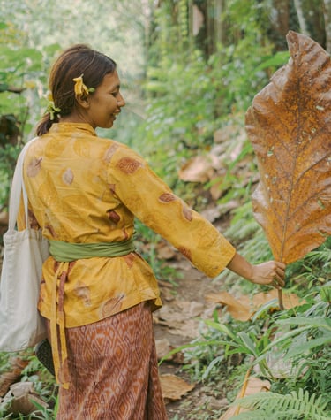Guided by panrimo—the Javanese spirit of gratitude—we harmonize the soulful touch of local women artisans with the wild elegance of the earth. Here, real leaves, wood, and flowers embrace the fabric to create our #youthfulecoprint.